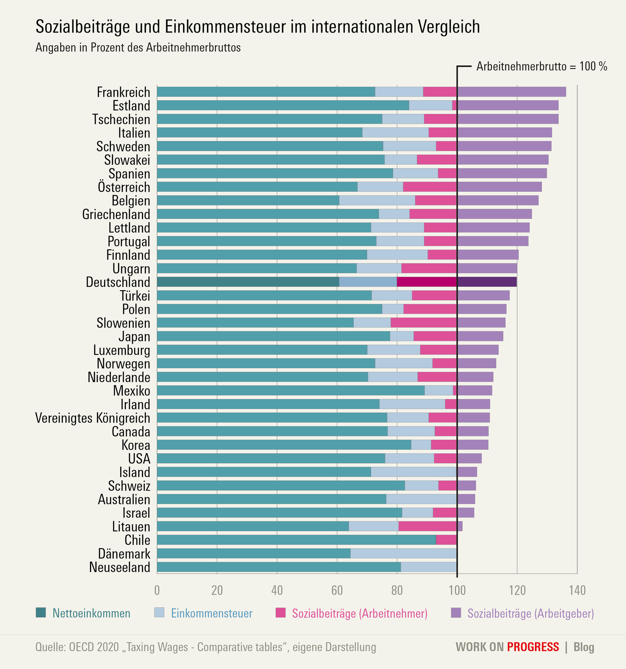Die Höhe von Steuern und Sozialabgaben sagt nichts darüber aus, wer sie zahlt oder wie hoch die Löhne sind. Die Zahlen verschleiern, wie ungleich die Lasten verteilt sind. Tatsächlich liegen die Arbeitgeberbeiträge im internationalen Vergleich nur im Mittelfeld. Was wirklich auffällt, sind die niedrige Löhne in weiten Teilen des Arbeitsmarkts.